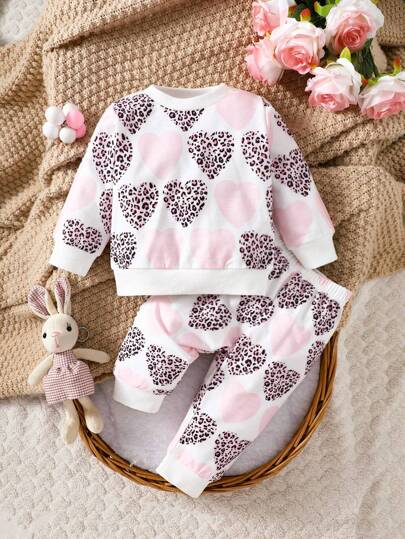 寶寶女孩豹紋愛心印花圓領運動衫和長褲套裝 - 淺粉色 - 查看 1