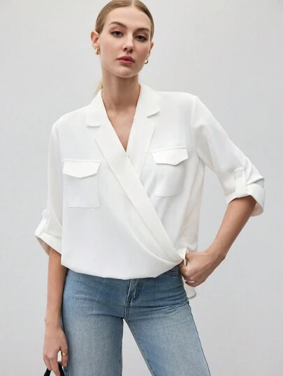 BizChic 女性休閒白色v領卷袖寬鬆夏季上衣
