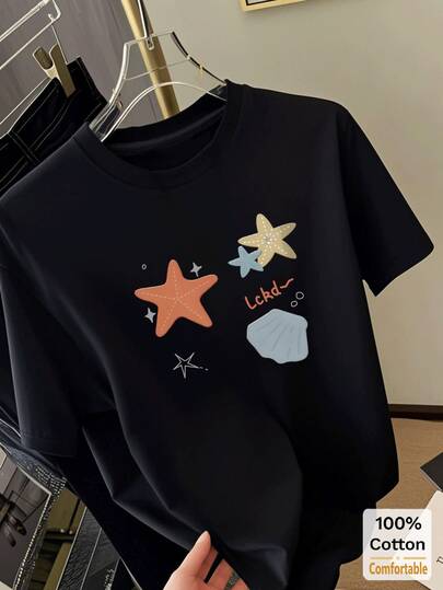Review: 这件T恤的质量真的很棒,面料舒服透气,图案设计也很可爱,星形和贝壳印花让衣服增添了趣味性。✨👚非常满意,推荐给大家!💖🌟