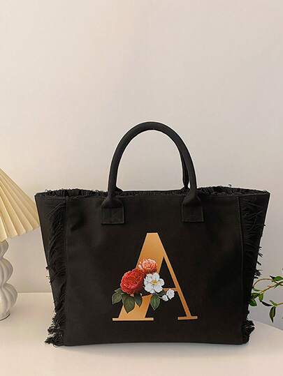 黑色帆布流苏单肩包,大容量手提包,学生笔记本电脑包 - 長方形 - 查看 1