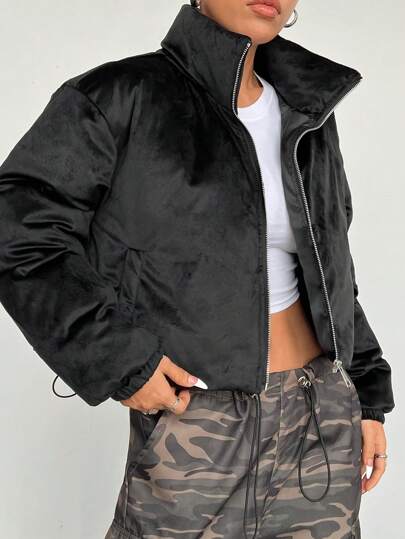 Flirla 黑色短款立领时尚百搭复古棉服夹棉外套冬季 - 黑色 - 查看 4