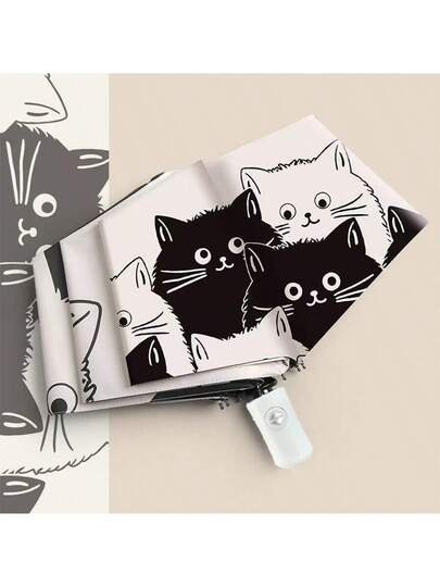 黑白猫自动伞,8根加固伞骨,黑色涂层,适合日常使用,防晒防雨,春夏之选,伴娘礼物,房间装饰,卧室装饰,海滩,旅行,男女皆宜,度假必备 - 彩色 - 查看 1