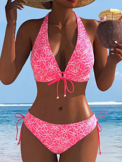 黑白花卉图案可调节比基尼两件套高腰泳衣,女士沙滩度假泳装套装