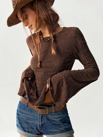 Bohemela 女士纯色针织蕾丝拼接喇叭袖修身常规T恤 - 棕色 - 查看 1