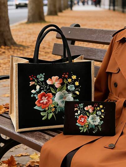 波西米亚风花卉图案手提包亚麻套装,女士手提包和钱包组合,单肩包,大容量手提包,购物袋。母亲节礼物