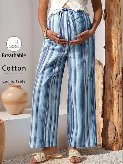 Boho Mama 孕妇条纹抽绳腰休闲百搭阔腿裤,适合日常穿着 - 薄荷藍 - 查看 5