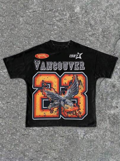 SHEIN 青少年男孩休闲简约图案数字 23 印花圆领短袖 T 恤,适合夏季 - 黑色 - 查看 1