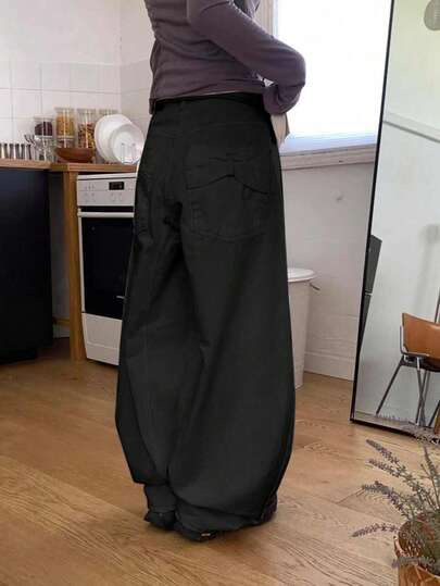 蝴蝶结后袋设计宽松灯笼裤女式牛仔裤,春季新品 - 黑色 - 查看 1