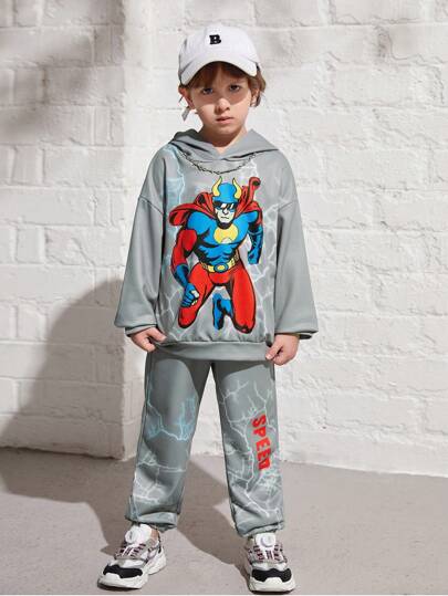 SHEIN 男孩可愛舒適卡通人物印花連帽衫連褲套裝 - 深灰色 - 查看 1