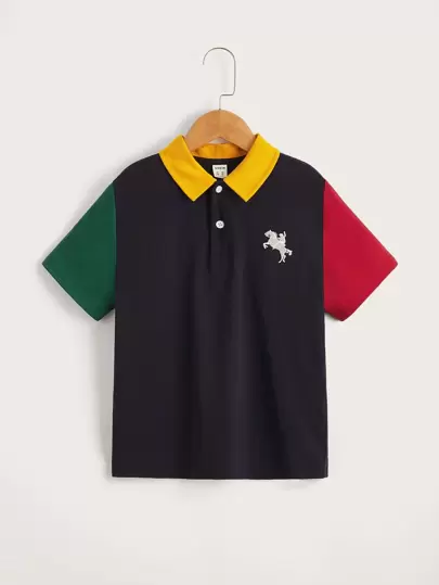 SHEIN 男孩撞色刺繡細節POLO衫 - 黑色 - 查看 1