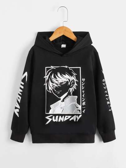 SHEIN 青少年男孩日文字母和数字图案卫衣 - 黑色 - 查看 1