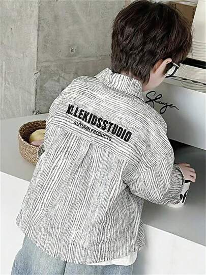 男童春秋条纹衬衫外套,背面字母刺绣,简约时尚,轻松搭配牛仔裤,打造休闲街头风 - 白色 - 查看 1