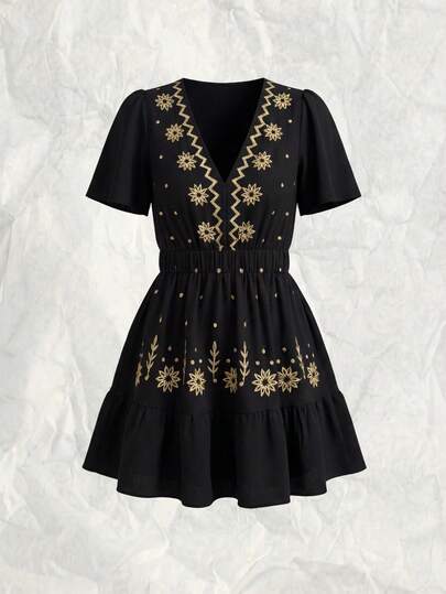 Olithes V领刺绣收腰A字短款连衣裙 - 黑色 - 查看 1