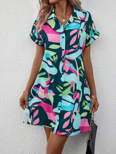 Breezaya 女士蝙蝠印花短袖纽扣衬衫裙度假海滩装 - 墨綠色 - 查看 1