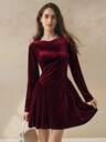 Cévolie 女式复古优雅咖啡棕色针织拼布雪纺 3D 花卉 A 字长袖连衣裙,春/秋