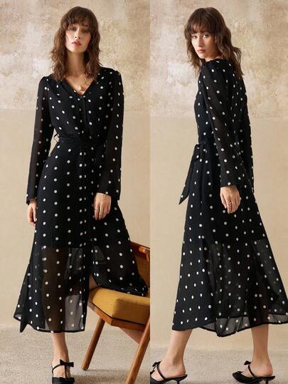 Cévolie 女士波尔卡圆点印花重叠V领泡泡袖优雅连衣裙 - 黑與白 - 查看 5