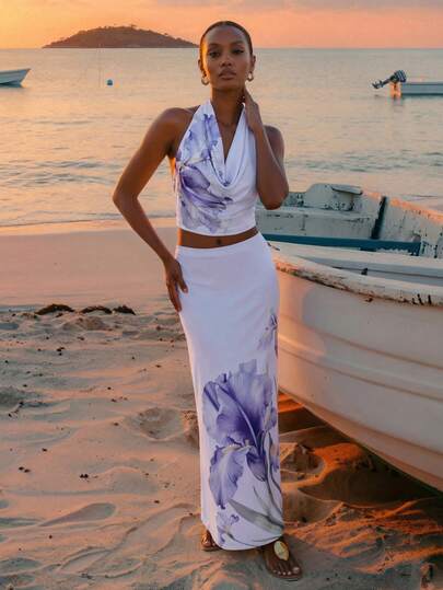 CAJUNI 两件套度假淡紫色特别印花上衣和长裙,夏季两件套 - 淡紫色 - 查看 2