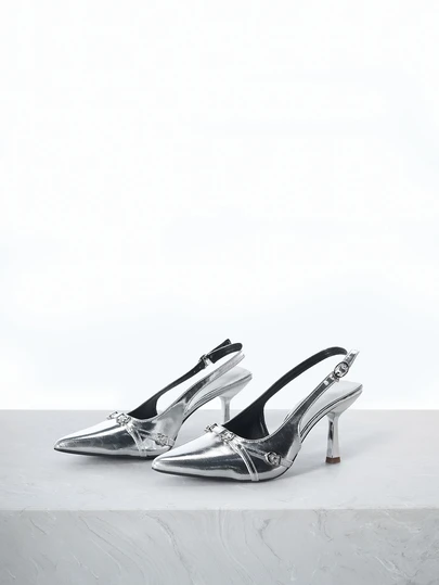 CHICVUE 2024春秋新款尖头金属扣细跟高跟套脚露趾凉鞋,女士圣诞礼物 - 銀色 - 查看 1