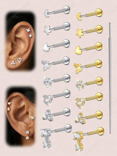 CIZME 20G 2件装平底耳钉,锥形不锈钢银色金色无螺纹推入式鼻钉环,心形星形蝴蝶吊坠耳钉,镶嵌锆石,适用于耳屏、耳软骨、耳廓、耳甲、唇钉、鼻孔、唇钉、鼻钉等穿孔饰品,男女皆宜
