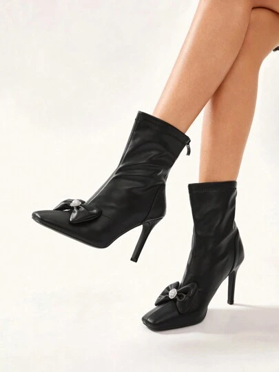 CUCCOO CHICEST 方头细高跟鞋复古设计蝴蝶结短靴搭配连衣裙,新款女式踝靴配后拉链秋季 - 黑色 - 查看 1