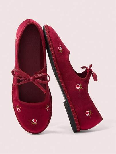 CUCCOO DOLLMOD 女士经典酒红色花卉刺绣丝绒蝴蝶结平底玛丽珍鞋 - 酒紅色 - 查看 1