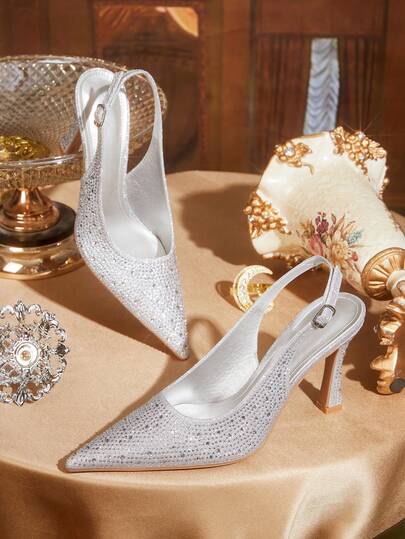 CUCCOO TILAWA 女士尖头细跟银色水钻性感时尚华丽后跟提拉鞋,搭配裙子,适合宴会、派对、夜店等场合,女士高跟鞋 - 銀色 - 查看 1