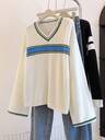 女式长袖圆领纯色毛衣,时尚休闲海军风条纹撞色围巾装饰宽松针织上衣,秋冬