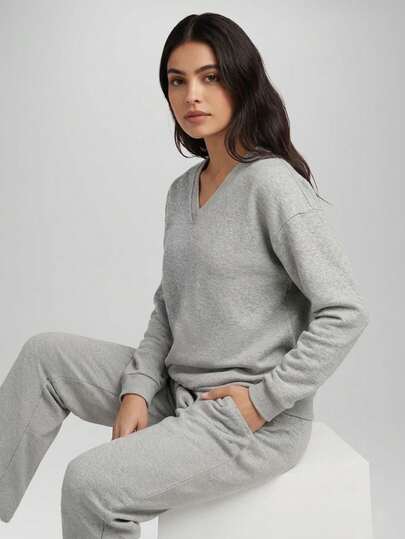 CZRLHYT 女士宽松V领蓬松抓绒卫衣和慢跑裤两件套,休闲舒适两件套,灰色 - 灰色 - 查看 7