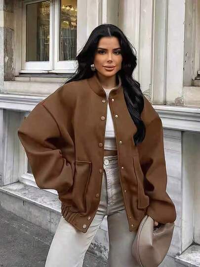 时尚欧美风格女式宽松羊毛混纺夹克,复古风,长袖,立领,大口袋,纯色,短款,秋冬 - 棕色 - 查看 1
