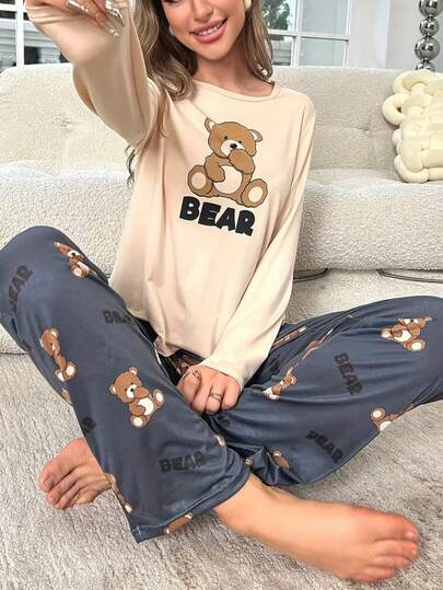 卡通熊印花长袖上衣和长裤睡衣套装,女士秋冬服装 - 杏色 - 查看 1