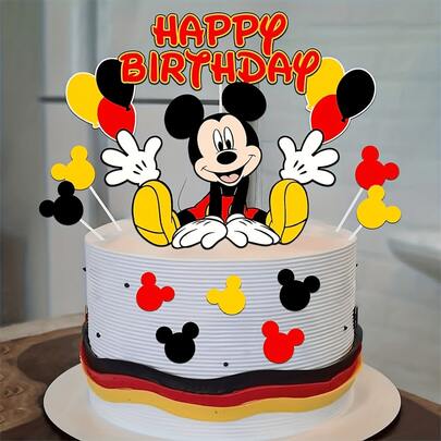 卡通老鼠生日蛋糕装饰套装,红黑黄/粉色领结老鼠纸杯蛋糕装饰插牌,配气球装饰,适合生日派对主题蛋糕装饰