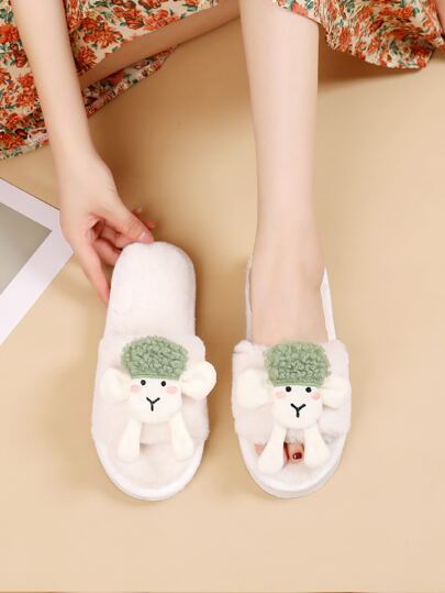 卡通羊裝飾毛茸茸趣味拖鞋 - 米色 - 查看 1