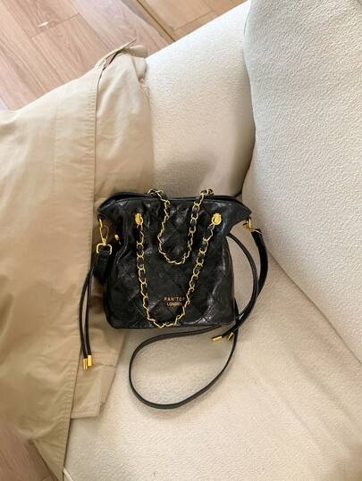 休闲简约菱形刺绣抽绳水桶包,轻便大容量女士单肩斜挎包,PU材质 - 黑色 - 查看 10