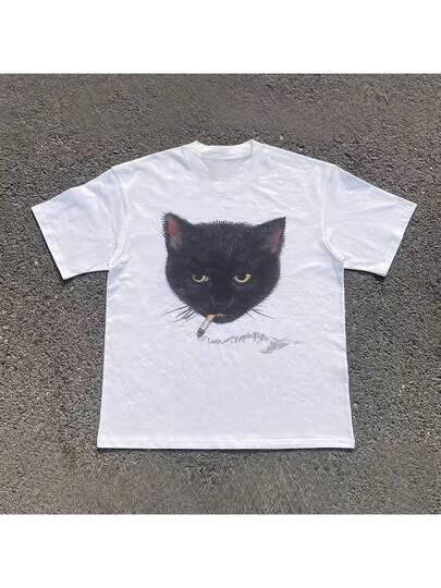 猫咪印花圆领短袖T恤,夏季休闲 - 白色 - 查看 1