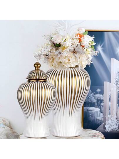 Ceramic Decorative Flower Vase Ginger Jar With Lid Centerpiece Decor For Tabletop Home Wedding Party Decor - 金色 - 查看 1