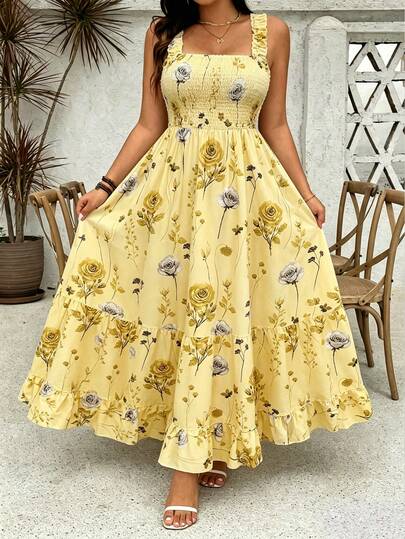 Ceyna 大码女式印花荷叶边吊带可调节胸围A字连衣裙长款女装