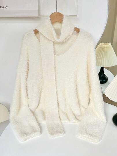 Chiquease 两件套女士毛绒套头毛衣配围巾,针织套头衫秋冬款 - 白色 - 查看 1
