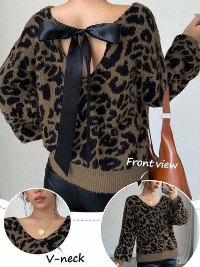 Chiquease 休闲豹纹提花针织毛衣,后背系带,秋冬针织套头衫 - 彩色 - 查看 6