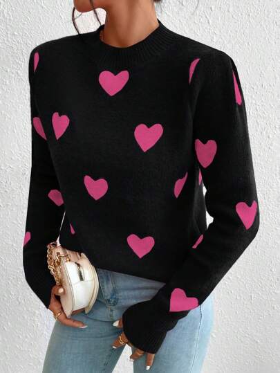Chiquease 女士爱心提花圆领休闲长袖套头毛衣,秋冬情人节针织套头衫 - 黑色 - 查看 1