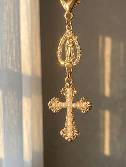 基督教主题十字架吊坠钥匙扣,饰有珍珠和钻石——十字架钥匙扣、包包挂饰、十字架吊坠、钱包装饰、背包装饰、耳机盒装饰、行李箱和汽车配件——单件饰品,饰有珍珠、钻石和浪漫元素