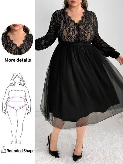 Enliva 大码女式灯笼袖中长蕾丝连衣裙/秋冬 - 黑色 - 查看 6