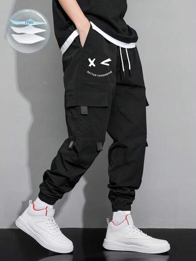 Claim Dot 宽松男士表情印花翻盖口袋抽绳腰工装裤,秋季 - 黑色 - 查看 7
