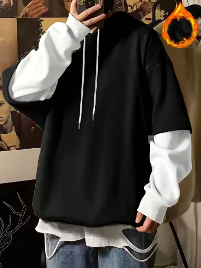 Claim Dot 男士宽松撞色二合一连帽卫衣,带抽绳,黑白配色,Y2K风格男士连帽衫,休闲男士连帽衫,秋季长袖上衣 - 黑色 - 查看 1