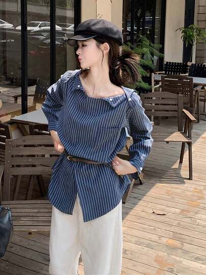 女士露肩条纹上衣,长袖,独特设计,开衩下摆,春秋季(随机条纹图案) - 藍色 - 查看 2