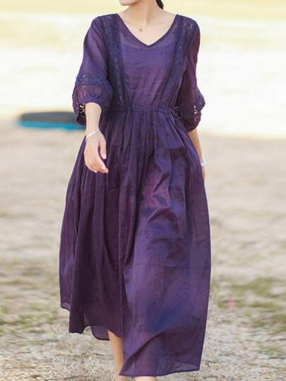 舒适时尚的极简主义七分袖V领系腰连衣裙,优雅清新 - 紫色 - 查看 1