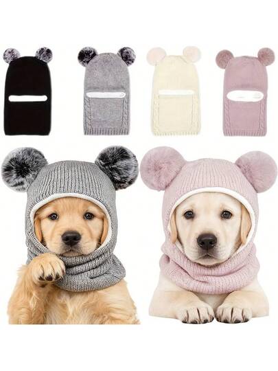 舒适针织保暖帽,适合中大型犬 - 柔软弹力涤纶氨纶混纺面料,降噪舒适,隔音针织宠物帽,适合中大型犬猫冬季佩戴,四季皆宜,可爱毛球设计(灰色/白色/粉色/黑色) - 彩色 - 查看 12