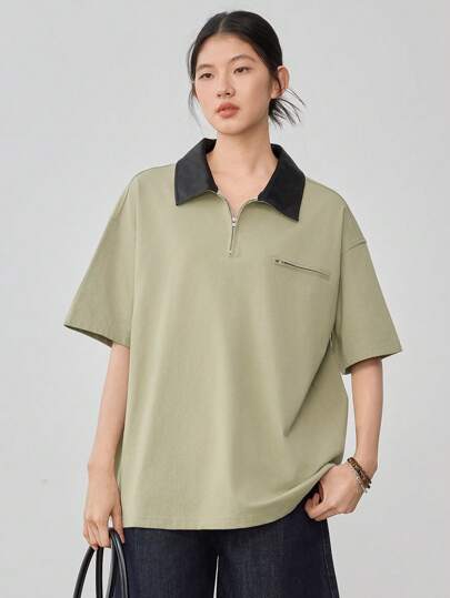 Dazy-Less 撞色块口袋装饰宽松短袖女式T恤超大T恤 - 橄欖綠 - 查看 1