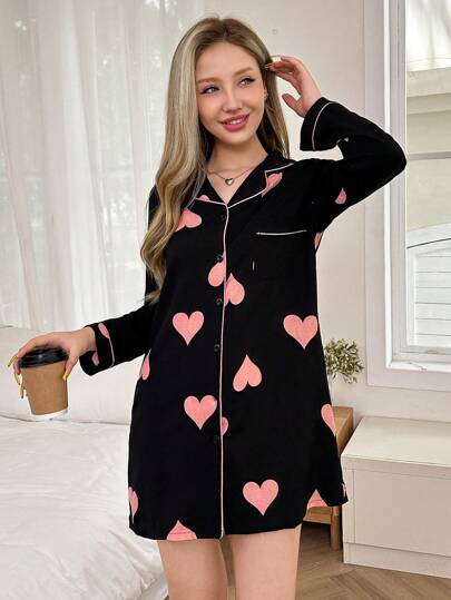 Snug Zone 撞色滚边心形泡泡印花翻领睡裙,女士秋冬款,宽松睡衣 - 黑色 - 查看 1