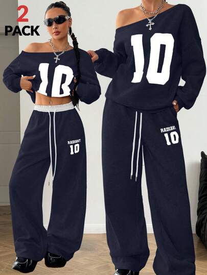 Coolane 女孩冬季 Y2K 学院风日常穿着数字印花保暖不对称领口长袖运动衫和白色松紧腰带阔腿运动裤 - 藍色 - 查看 1