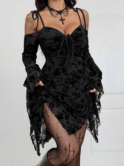 Coolane 女士秋冬四季皆宜 Grunge 哥特 Y2K 朋克街头风锐舞派对装扮夜店服饰弹力舒适网纱露肩长袖黑色优雅连衣裙 - 黑色 - 查看 5